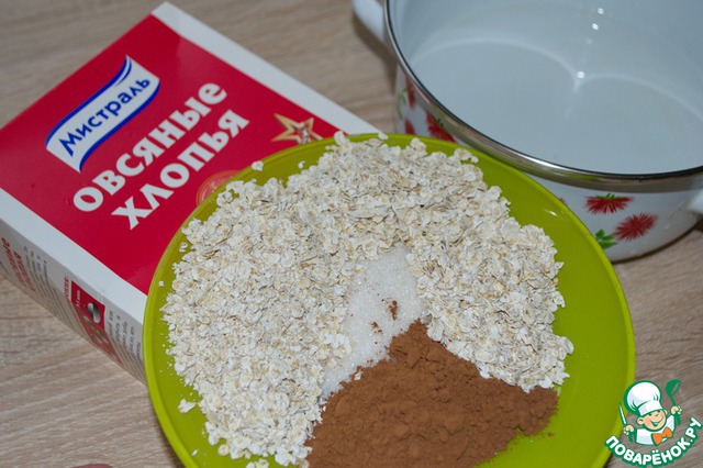 Берем небольшую кастрюлю, наливаем воды. Отмеряем нужное количество хлопьев, сахара (можете добавить по своему вкусу), какао.