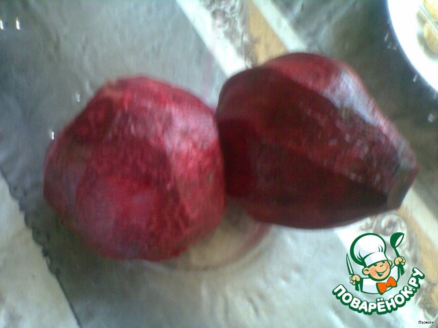 Берете свеклу, выбирайте цветом потемней, очищаете ее от кожуры и режете. Желательно порезать мелкими кусочками.