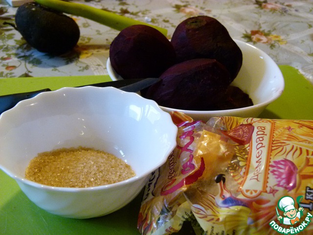 Уложить в банку свеклу, добавить сахар. Я использовала тростниковый сахар фирмы Мистраль, так как это придаст дополнительный привкус и поможет лучшему брожению нашего кваса. Залить 3 литрами теплой кипяченой воды, накрыть крышкой и оставить.