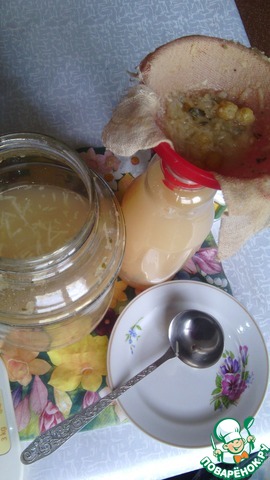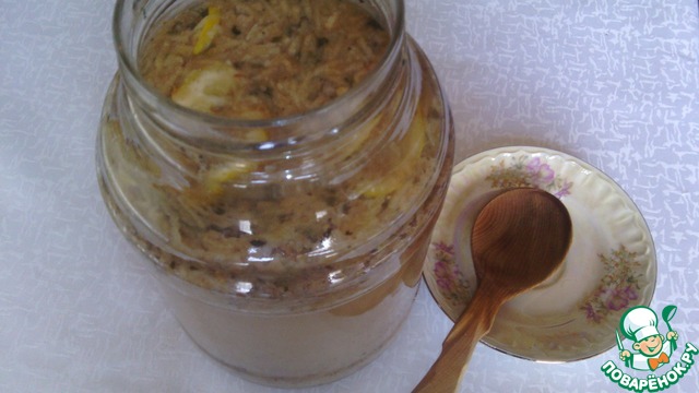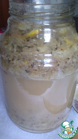Закваску смешать с солодом в отдельной таре, развести понемногу остывшим настоем муки 100-200 мл, для лучшего растворения. Туда же добавить мед, размешать. Затем перелить в банку с настоем муки. Положить туда же промытый изюм. Для фруктового варианта добавить натертое на терке яблоко и нарезанный тонкими небольшими ломтиками лимон. Если нужно, долить кипяченой воды ( не выше 30 градусов), не доливая до верха банки 4-5 см. Все перемешать, накрыть марлечкой и поставить кваситься при комнатной температуре ( до 30 градусов ) на 24-36 часов. Чем выше температура, тем быстрее зреет квас.