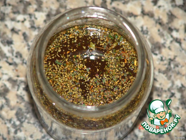 Залить смесью из винного уксуса и оливкового масла, посолить. Соус накрыть плотной крышкой и поставить в холодильник не менее чем на 3 дня. Вкусовые свойства соуса при настаивании улучшатся. Количество добавляемой соли зависит от цели использования соуса. Больше соли - если используем как маринад перед приготовлением гриля, меньше - если для смазывания мяса в процессе гриля и еще меньше - для подачи к столу. Сервируется соус охлажденным. Приятного аппетита!