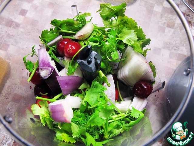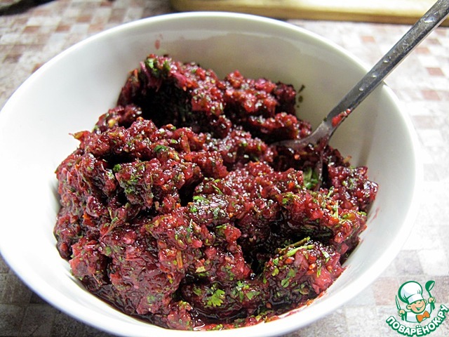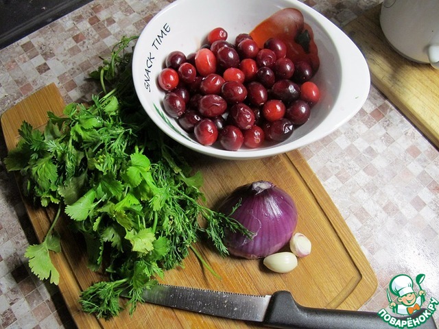 Пропустить клюкву, зелень, лук, чили и чеснок через блендер. У меня была польская мороженая клюква, суховатая по сути. Поэтому дип получился похожим на джем. С обычной клюквой он будет более жидким.
