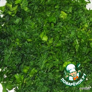 Зелень порезать мелко. У нас была петрушка и укроп. Я очень пожалела, что не взяли кинзу и базилик.