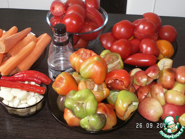 Все ингредиенты (кроме чеснока и уксуса) пропустить через мясорубку (или измельчить с помощью комбайна), поставить на медленный огонь, варить в течение 40 - 60 минут. Добавить чеснок, через пять минут уксус. Все, разливаем по банкам, наслаждаемся зимой.