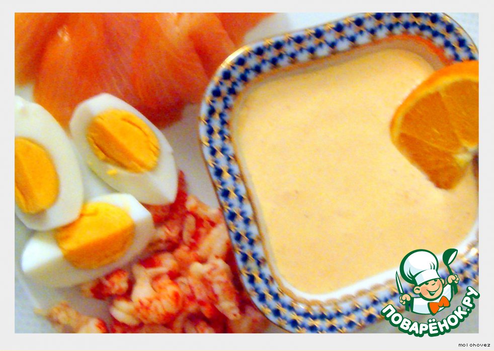 Смешать майонез с кетчупом, добавить ром и свежевыжатый апельсиновый сок. Хорошо размешать. Посолить, поперчить.