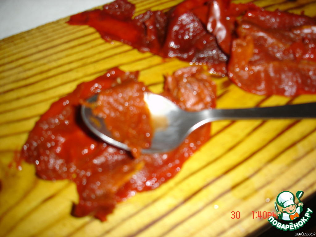 Постепанно добавляем другие ингредиенты: мякоть красного перца, очищенные от кожуры печеные чеснок и помидоры,
