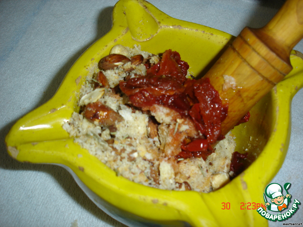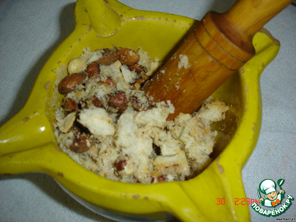 Начинаем приготовление соуса: в ступку закладываем подсушенные миндаль, хлеб, соль и толчем до однородной массы.