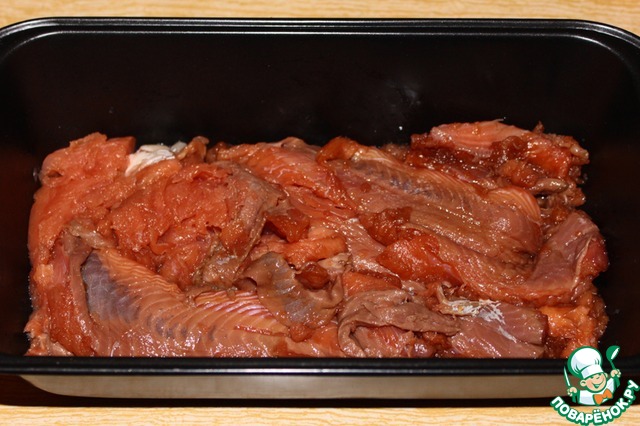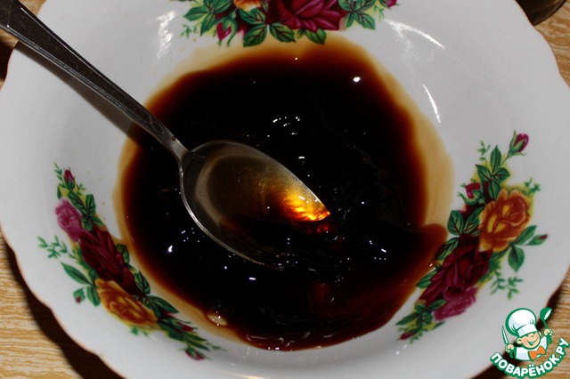 К соусу я приготовила рыбу на пару. В противень налить 2 ст. л. соевого соуса "Kikkoman". Выложить филе рыбы без кожи и костей, обваляв каждый кусочек в налитом соусе. Добавить небольшое количество воды.