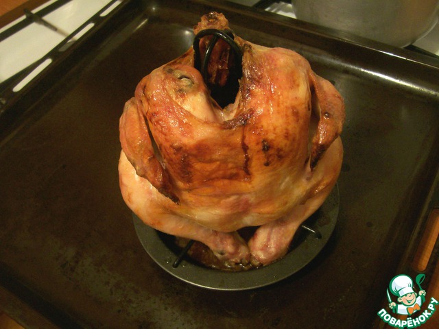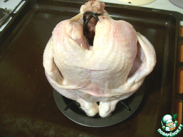 Вынуть курицу из маринада, промыть холодной водой, обсушить, смазать растительным маслом и поместить на вот такое приспособление для запекания. У кого нет такого девайса, можно запекать на решетке. Запекаем при 200 градусах 1 час.