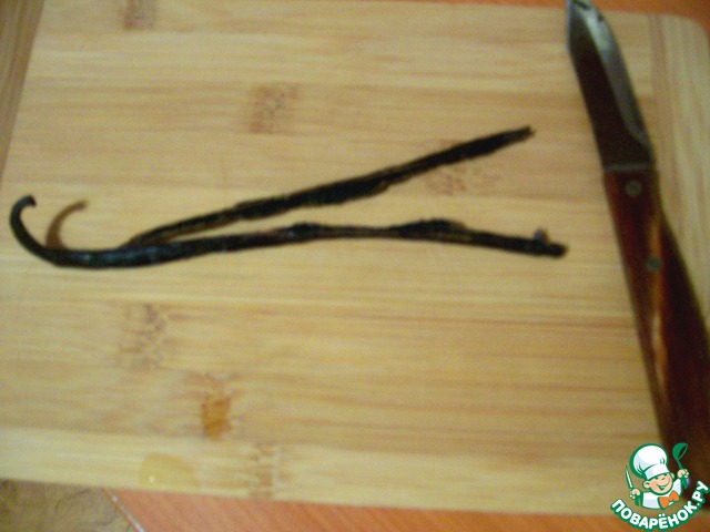 Пока птичка запекается, приготовим клюквенный соус. Стручок ванили разрезать и выскрести сердцевинку. Положить сердцевинку в кастрюльку.