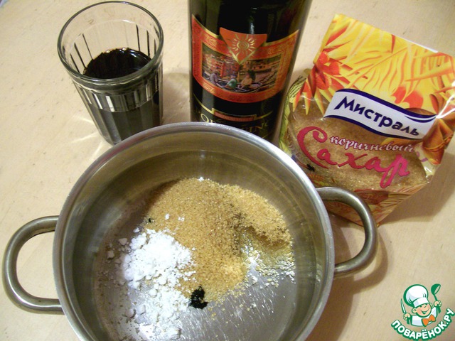 Насыпать туда сахар и крахмал. Подготовить вино.