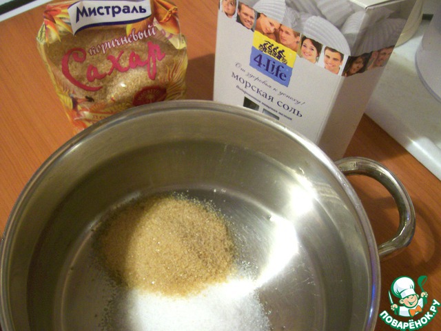 Сначала замаринуем курицу. Подготовим маринад. Положим в кастрюльку соль и сахар.