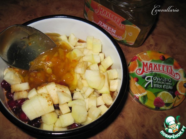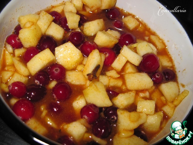 В сотейник поместить клюкву, яблоки, имбирь, добавить воду, сахар, специи, винный уксус и апельсиновый джем "Махеевъ". Все перемешать.
