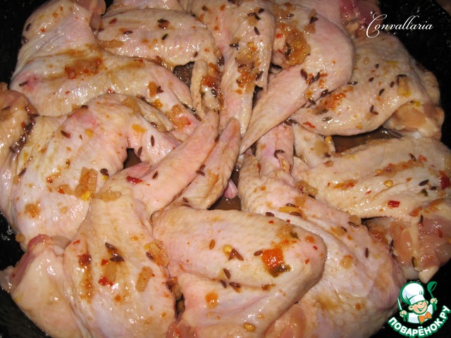 Маринадом залить куриные крылья и оставить мариноваться на 6-8 часов.