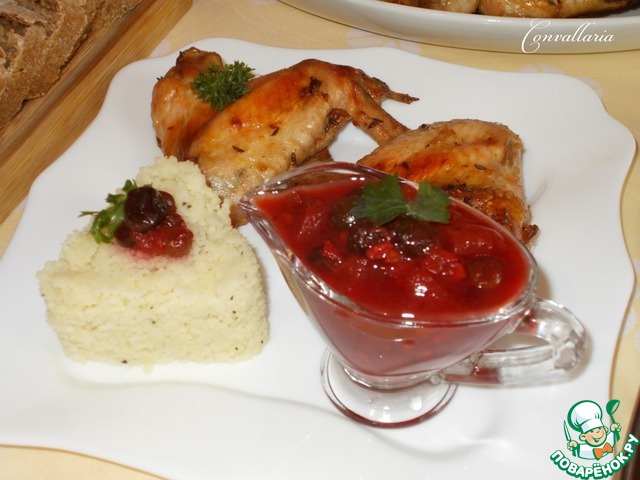 Перекладываем крылышки на блюдо и подаем с клюквенным чатни.