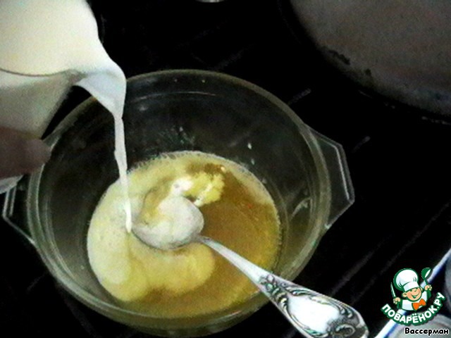 Когда мед и масло растопились (или почти растопились), доливаем молоко и доводим всю массу до кипения.