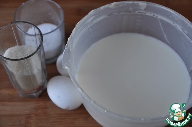 В молоко комнатной температуры кладём яйца, соль, сахар и взбиваем миксером до растворения сахара.