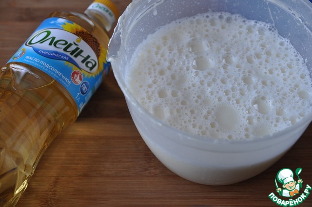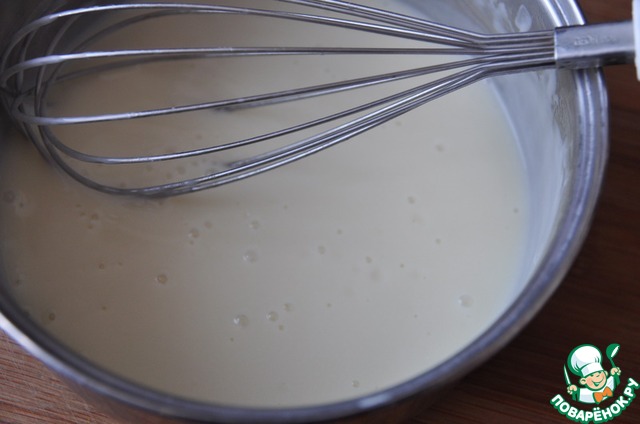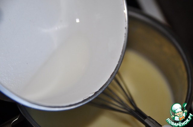 И в три приёма заливаем молоко в желтково-сахаро-масл яную смесь, всё перемешиваем венчиком до полного растворения.