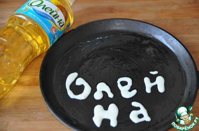 Сковороду смазываем кисточкой подсолнечным маслом "Олейна", эту процедуру можно повторить несколько раз во время выпечки.