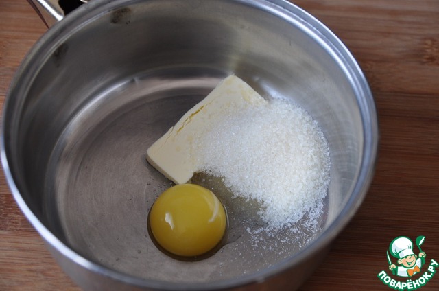 Растираем сливочное масло (комнатной температуры 20 г) с сахаром и желтком одного яйца.
