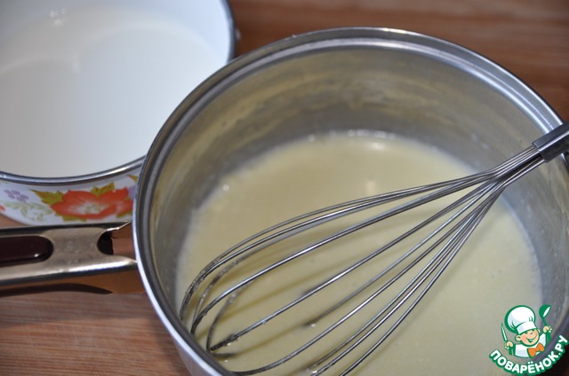 Ставим смесь на средний огонь, помешиваем. Вводим крахмал, растворённый в 20 мл молока.