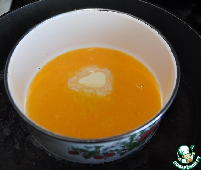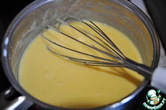 Добавляем желток с миндальной мукой к мандариновому соку, перемешиваем до заваривания. Добавляем заваренную молочную смесь, соль, ещё раз всё перемешиваем до однородности.