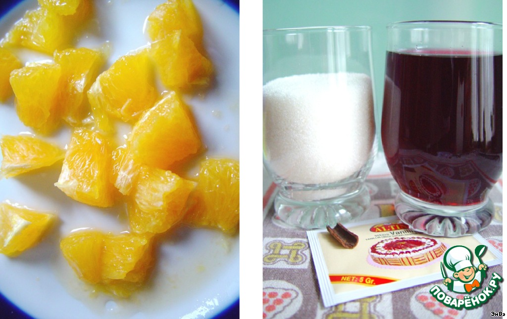 Отложенную половинку режем на кусочки. Для основы соуса берем красное вино, сахар, ванильный сахар и маленький кусочек коричной палочки