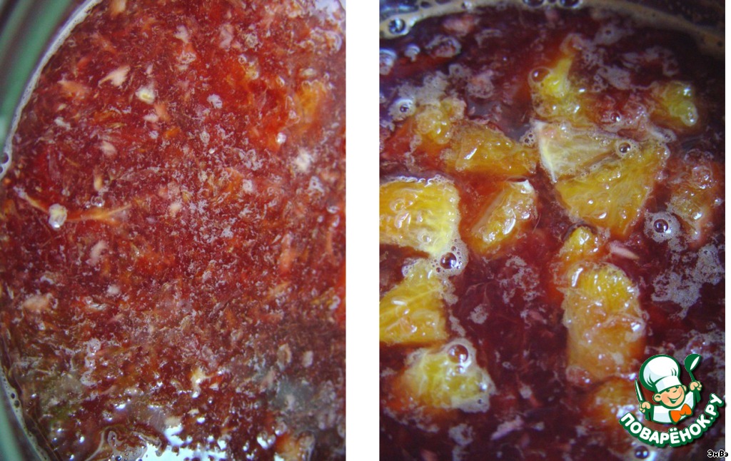 В кастрюльке соединяем все компоненты основы, ставим на низкий огонь и помешиваем до полного растворения сахара. Доводим до кипения, накрываем крышкой и оставляем медленно кипеть 7-10 минут, после чего добавляем апельсиновое пюре и держим на огне еще 3 минуты. По истечении этого времени кладем в соус кусочки апельсина, перемешиваем, опять накрываем крышкой и выключаем огонь