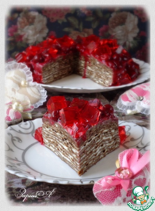 | Опять любимая черемуха, но уже в блинном тесте. Получился очень вкусный блинный торт. Миндальный вкус черемухи и пломбирного крема - великолепный тандем. А кислинка вишневого соуса, только подчеркивает всю прелесть десерта. А чтобы торт смотрелся красивее... украсьте его кубиками из вишневого желе - они так похожи на рубины! Масленица продолжается! Угощайтесь! |
