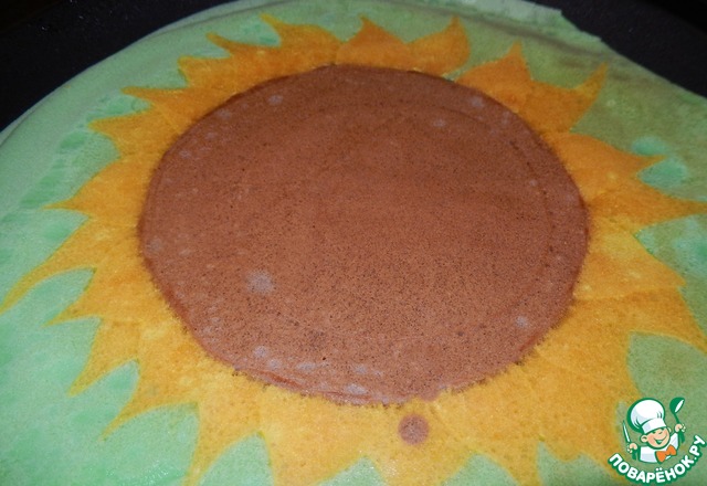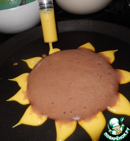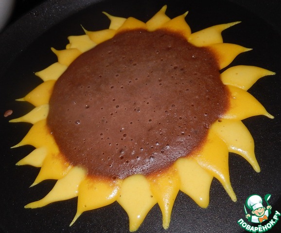 Начинаем творческий процесс. В середину выкладываем 1-2 ст. л. шоколадного теста. Желтым рисуем лепестки, рядом с краем шоколадного блина наливаем небольшие порции теста, затем растягиваем ее от центра к краю сковороды. рисуем сначала первый рад, оставляя расстояние между лепестками.