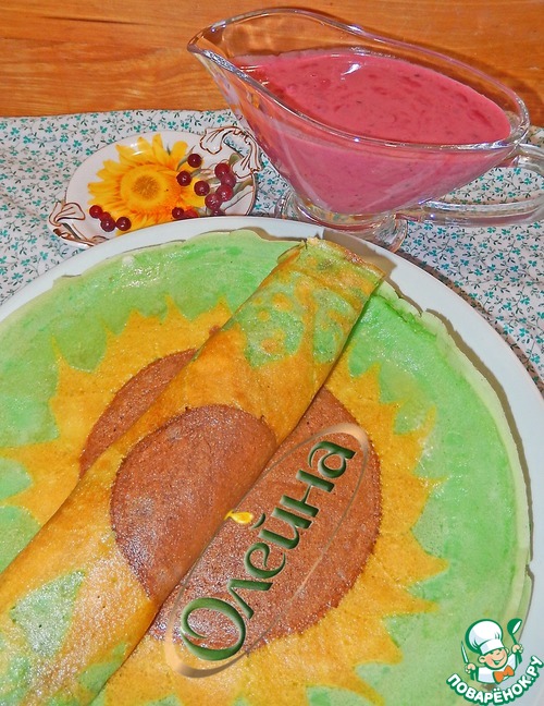 | Кисло сладкий соус из брусники, с нотками апельсина, и сливочными мотивами. Полезен большим содержанием витамина С. И яркие весенние блины похожие на картинки, которые украсят стол и вызовут бурю эмоций. |