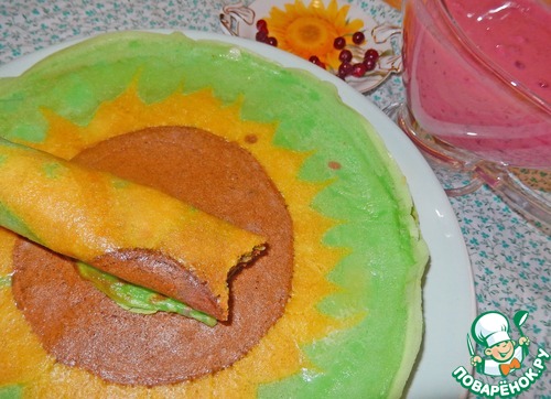 Затем в пробелах дорисовываем остальные лепестки по кругу. Можно оставить блинчики и в таком виде. Я заполняла пространство вокруг нашего подсолнуха зеленым тестом. Затем, когда оно схватывалось. Переворачивала и жарила со второй стороны.