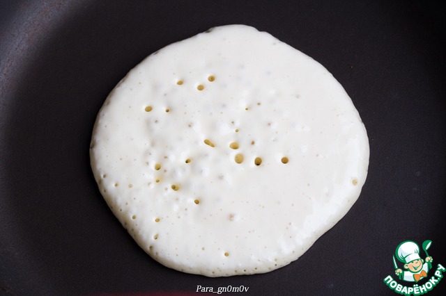 7. Сковороду хорошо разогреть. На сухую (!) сковороду вылить количество теста, необходимое для панкейка. У меня для этого отлично подходит поварешка от мультиварки, самый подходящий размер. Немного разровнять тесто ложкой (при необходимости). Как только на поверхности появились пузырьки, но еще не лопнули, переворачиваем панкейк на другую сторону и печем до зарумянивания (у меня, пока фотографировала, часть пузырьков все-таки лопнула). Как только панкейк начинает свободно сдвигаться, он готов.