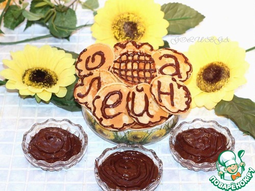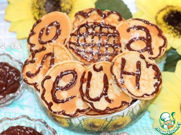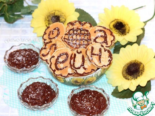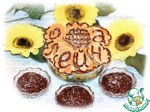 Выпекаем блинчики на хорошо разогретой сковороде с двух сторон. Можно выпекать большие блины, это будет быстрее. Подаем блинчики с приготовленным шоколадно-банановым соусом.