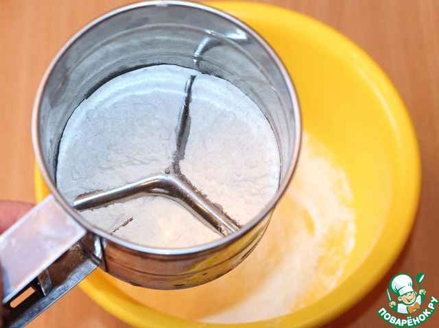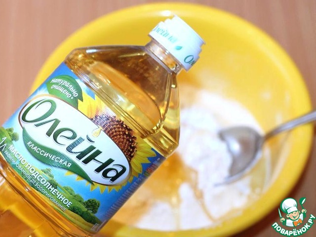 Сделать углубление посередине, добавить яйцо, 1 ст. л. сахара и 2 ст. л. растительного масла. Постепенно влить молоко и перемешать (если густо можно еще добавить молоко).