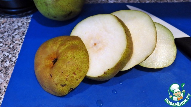 Теперь подготовим грушу. Ее нужно помыть, обсушить. Разрезать каждую на 4 части (основание+2 кружочка+верхушка).