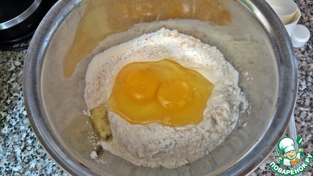 Приготовим тесто. Муку и разрыхлитель просеиваем в миску. Добавляем яйцо, сахар, соль и ванилин.