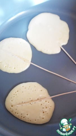 Небольшое количество теста выливаем на горячую сковороду. Укладыааем деревянную шпажку (для шашлыка) таким образом, чтоб в тесте оказалась меньшая часть шпажки. Сверху на шпажку наливаем ещё немного теста.