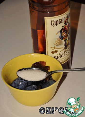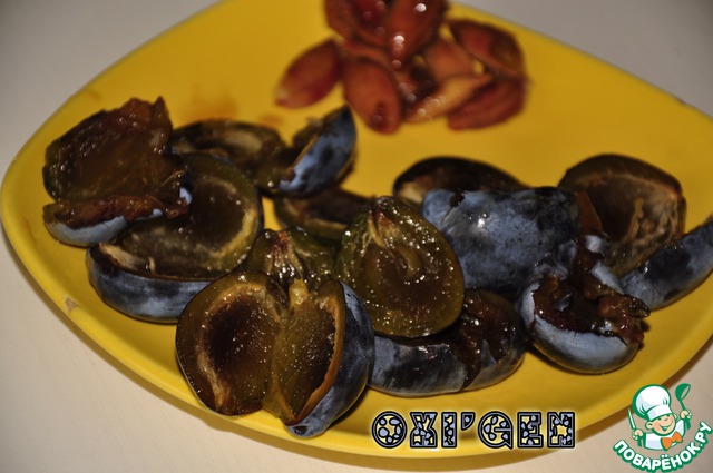 Очистить сливы от косточек, перемешать с сахаром и ромом. Вместо рома можно взять вино "Мускатель", обалденный аромат. Оставить мариноваться минут 30.