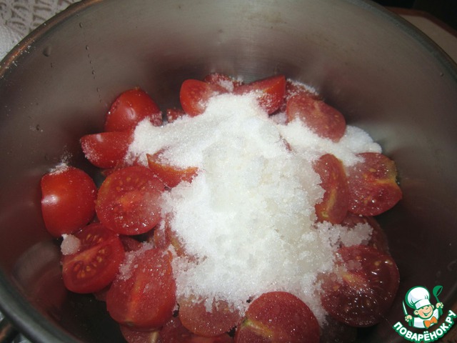 Помидоры вымыть, дать высохнуть, затем разрезать пополам.