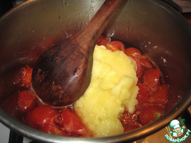 Добавить пюре к помидорам. Влить уксус. Поварить 5 минут.