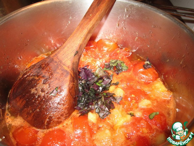 Измельчить базилик, выложить в кастрюлю. Все перемешать. Оставить до утра на плите.
