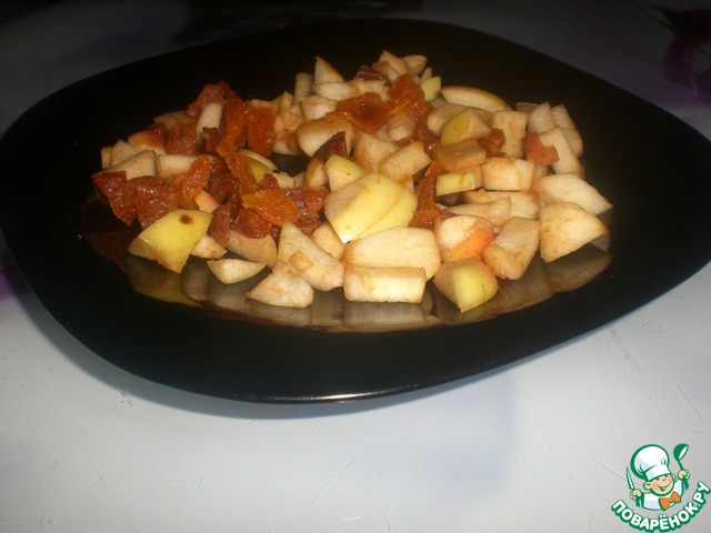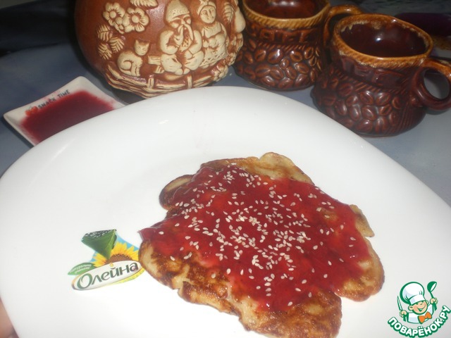 | Толстые традиционные блины на дрожжах с припеком из фруктов - яблок и кураги - дополнены ароматным соусом. Корица, имбирь, мускатный орех создают неповторимые пряные ноты в соусе из брусники. Такой соус подойдет к любым блинам по вашему любимому рецепту. |
