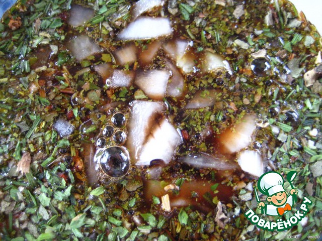 перемешиваем с [b]"ароматическими травами для салата"[/b] (укроп, петрушка, сельдерей, базилик) и уксусом (бальзамическим и уксусом из красного вина).