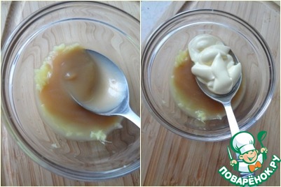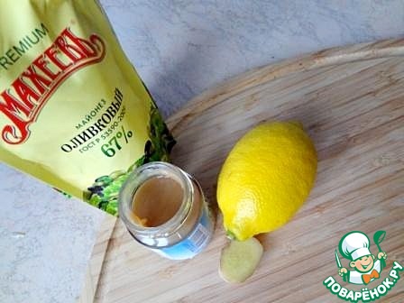Смешать яблочное пюре (я беру детское питание), майонез, добавить сок имбиря (Аксинья, АлексЮстас, спасибо! Пользуюсь твоим способом, добываю сок с помощью пресса для чеснока!).