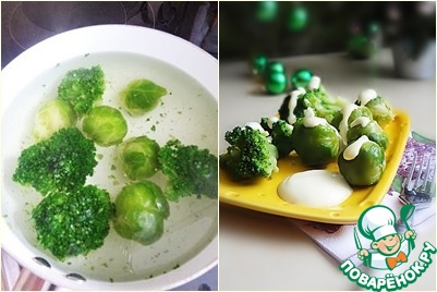 Один из вариантов подачи - с отварными овощами. Я взяла брюссельскую капусту и брокколи. Овощи отварить, слегка остудить. Подавать, полив соусом. Вкусно!