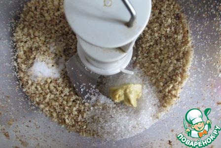 Всыпаем орехи в чашу блендера и измельчаем в мелкую крошку.