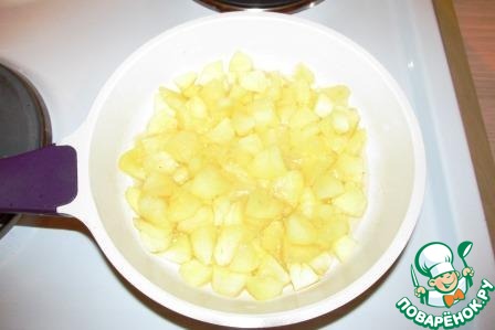 Яблоки чистим от кожуры и семенной коробочки и нарезаем тонкими дольками. Выкладываем яблоки в сковороду, поливаем лимонным соком, засыпаем сахарной пудрой, посыпаем маленькой щепоткой соли для усиления аромата, вливаем 3 столовых ложки воды и ставим на средний огонь.