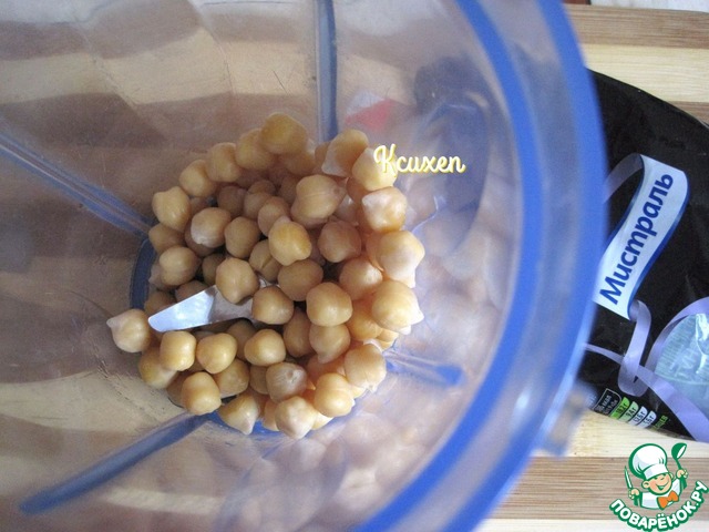 В блендере измельчаем нут, зубчик чеснока и немного отвара до получения гладкого густого пюре.