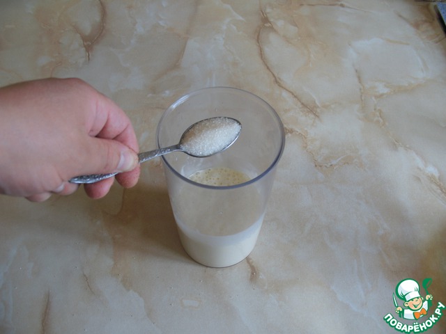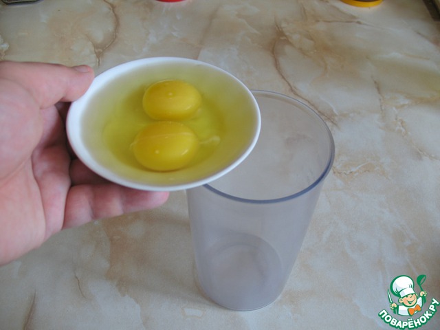 Взять половину приготовленного масла и тонкой струйкой вливать в стакан уже со взбитыми яйцами, непрестанно взбивая этот процесс блендером.